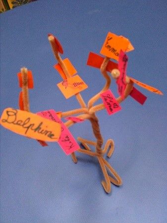 Enfants et parents ont fabriqué des poissons de différentes tailles dans une matière brillante. Ils ont ensuite été montés avec des tiges sur un petit plateau. Les enfants ont pu donner par la suite un nom à chaque poisson correspondant à des personnes de leur environnement qui leur sont chères (famille, camarades, professeurs…).